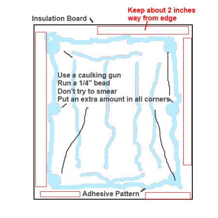 Always measure-- then dry fit your insulation board before applying adhesive (blue on the example).  Observe the contact points between the board and the container.
