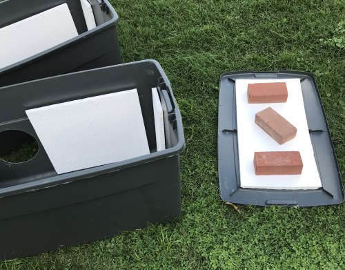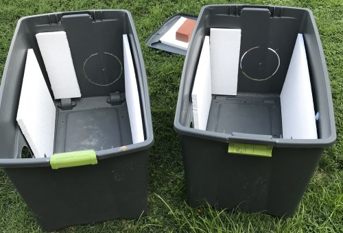 Over the past five years, I thought about some insulation concepts.  It is a tough topic, since adding insulation with a small container with two sizable holes seems incongruous.  So I began experimenting with just small amount of insulation (rigid foam board).  (This size will work if you only have one box, or you can find some similar insulation materials at your local big box store.) Without getting more technical than necessary, it is important to note that the foam board will be exposed to some moisture even when the top is in position.,  Some types absorb moisture and some are more resistant (XPS).