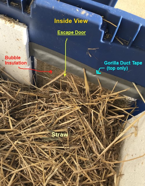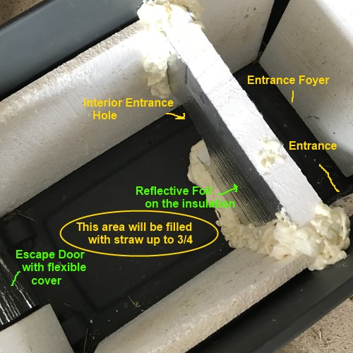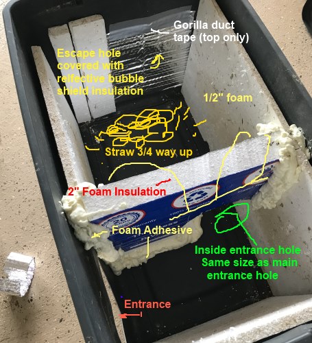 Of course, you can see the obvious flaws to this approach:  the foam board did not completely touch every part of the sides, the escape hole continued to let air in and some heat out, the big entrance hole let in wind and the cold., the insulation was too thin.
