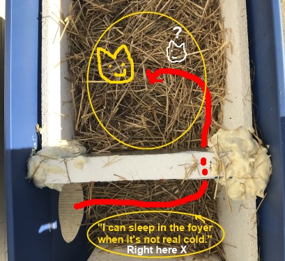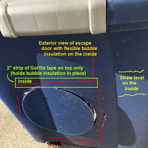 This allows the cat to escape simply by pushing through the flexible insulation.  Does it work:  Last week one of my ferals pushed the straw too close to the door or two tried to maneuver--the flexible insulation gave way (as it should) and allowed the escape door to open and part of the insulation was forced outside.  Just a slight push won't open the door, but if the cat has to leave quickly, there shouldn't be any problem. Perfect= no ... Compromise= yes.