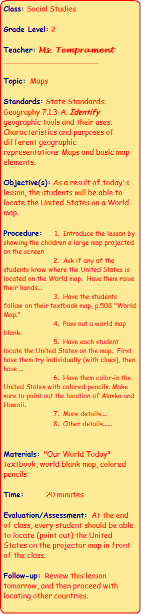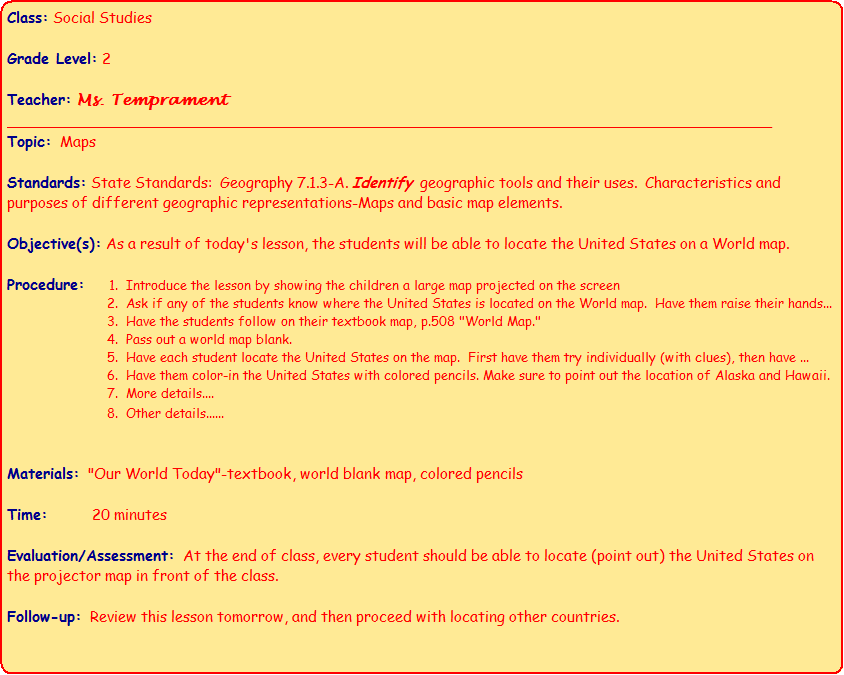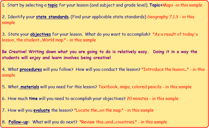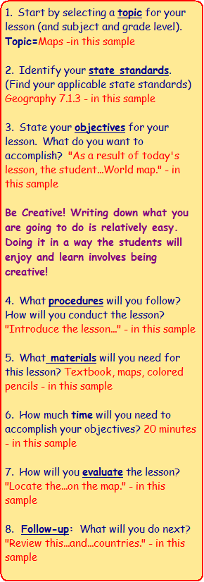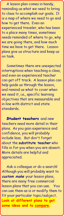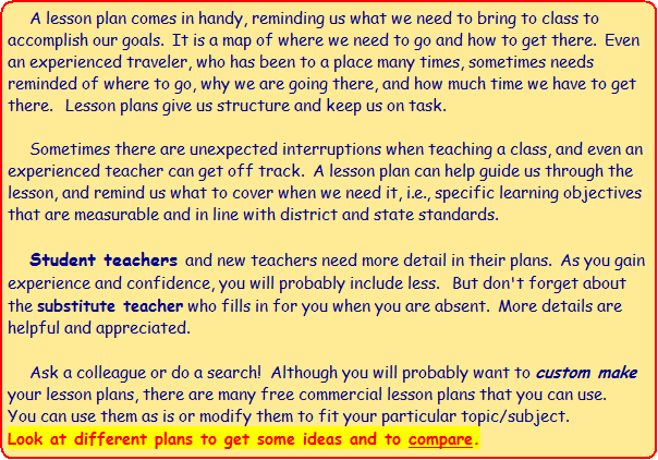 or more detailed plans--see both on this site. Adapt lesson plans to fit your school's format. Note: Viewing a variety of lesson plans makes writing your plans easier by exposing you to different ideas and formats.