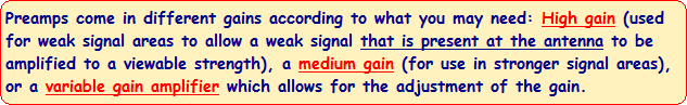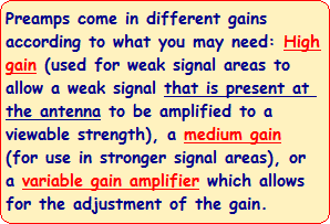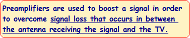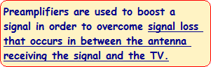 A preamplifier (or preamp) is used for weak to moderate signal areas to allow a weak signal that is present at the antenna to be amplified to a viewable strength. A preamp is designed to be installed at the beginning of a long coax run or before a splitter in order to offset loss in the coax/splitter.